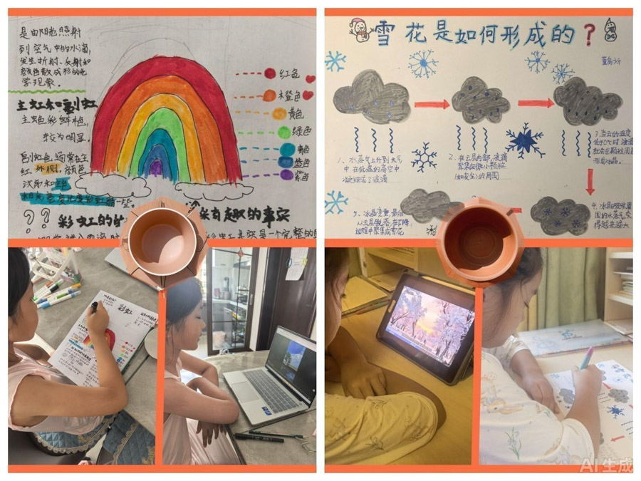 还有的探讨风雨雷电、彩虹等自然现象的形成机制及影响。共有10位同学参与此方向调研,在徐老师的建议下同学们分别调查探究了5种大自然的现象,其中包括雪的形成、彩虹、雨水、云等,对它们的特点、形成原因,以及对我们人类的影响进行了详细的研究。