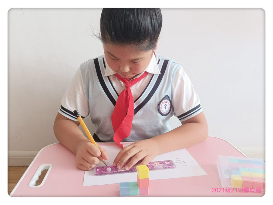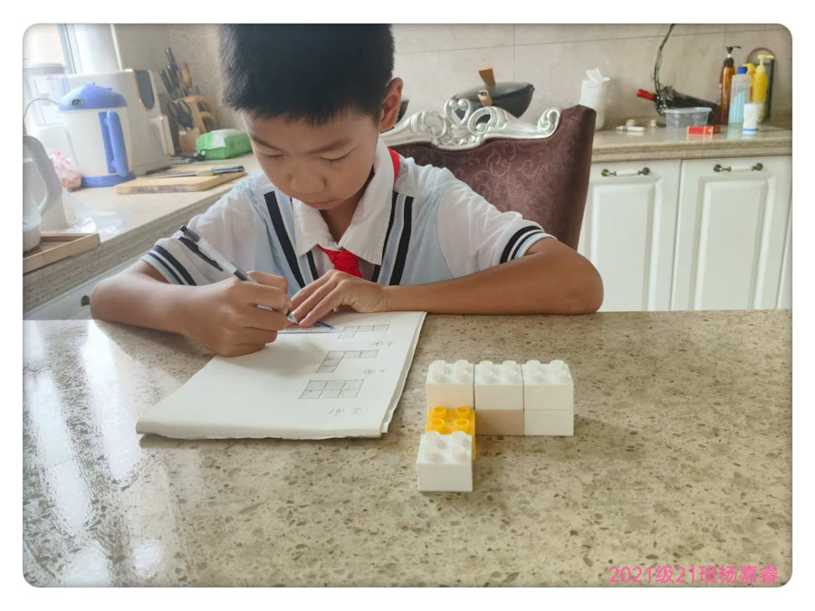 为了将城堡的正面、上面、左面绘制进手册,孩子最初难以区分左右。家长建议:“你可以站在城堡的左边,用手机拍一张照片,然后对照照片来画,就像美术课上的‘写生’一样!”在绘画过程中,孩子觉得视图过于单调,便想起了美术课上的“装饰技巧”,用红色填充可见的正方形,用虚线勾勒出被遮挡的部分,并在旁边画了一个小太阳作为装饰。旁边附注:“正面视图有2行,看起来像台阶一样——这是孩子发现的小规律!”——数学的严谨观察与美术的创意表达相结合,使得视图既精确又吸引人。
