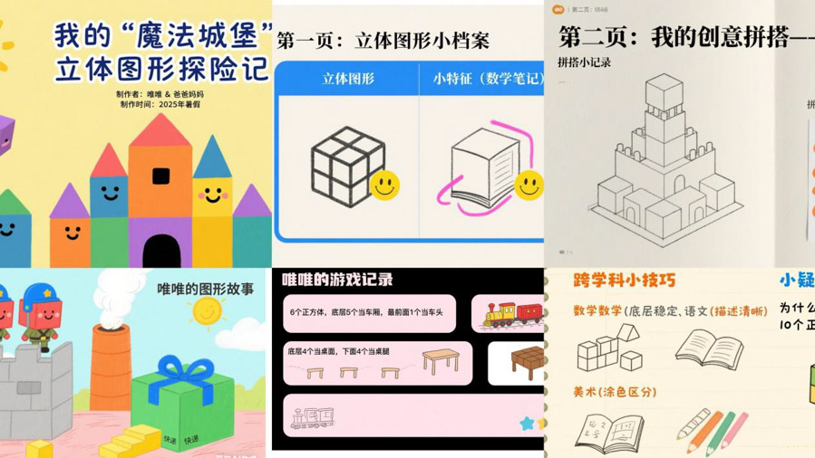 带着“如何将立体图形知识融入亲子活动,使知识与生活相结合”的思考,我们在与家长和孩子们的交流中发现:仅仅通过拼搭积木来学习数学,孩子们感到缺乏乐趣;而仅仅绘画或讲故事,又缺少了知识的深度。大家普遍认为:需要找到一个“用知识解决实际问题”的小项目,让数学、语文、美术自然地融入其中。最终,我们确定了以“设计一套‘家庭立体图形趣味手册’”作为核心项目——手册中应包含自己拼搭的立体造型、绘制的视图、创作的图形故事,以及与家人一起参与的游戏。这个项目不仅需要运用数学知识进行拼搭和绘图,还需要语文能力来表达和编写故事,更需要美术技巧来进行创意美化,正好可以让知识在亲子合作的过程中变得生动而有趣。