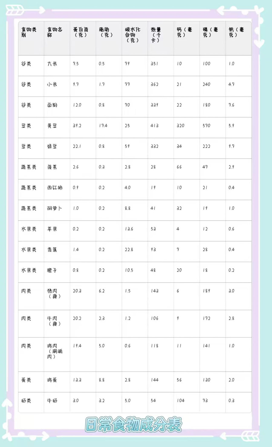 通过书籍、网络、科普视频等途径,同学们收集到各类食物的营养成分信息,制作出食物营养成分表。