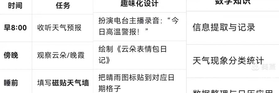 天气是多变的,时而晴、时而雨、时而阴……变幻莫测。结合所学的统计单元知识,用数学的眼光观察、了解气象知识,感知天气情况,感受气温变化,探索天气奥秘的同时感受气象魅力,而暑假是天气变化最丰富的季节——高温、暴雨、台风、彩虹等气象现象频现。为延续“用数学观察生活”的理念,我们班级将开展暑期特别版气象研究项目活动,引导学生通过数据收集与分析,解码夏季天气奥秘,体会统计在真实场景中的应用价值。