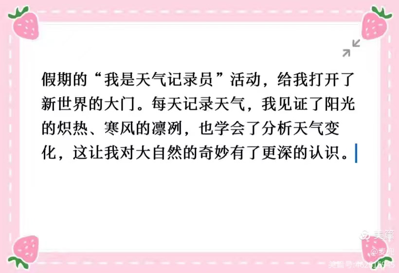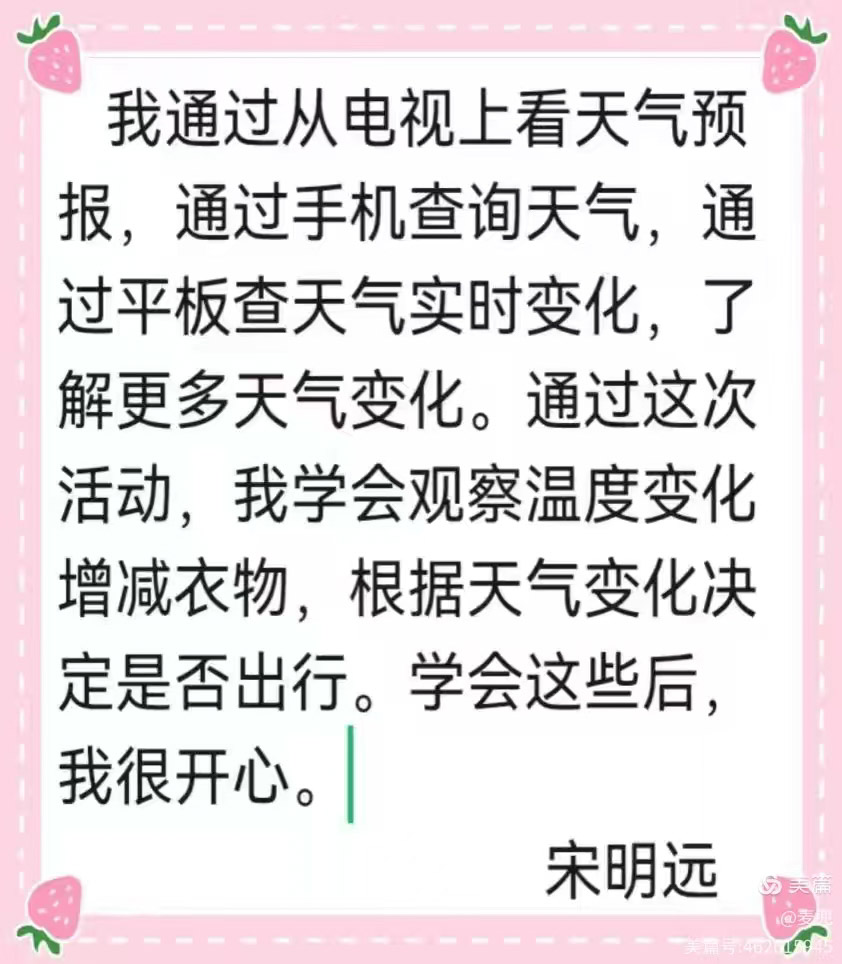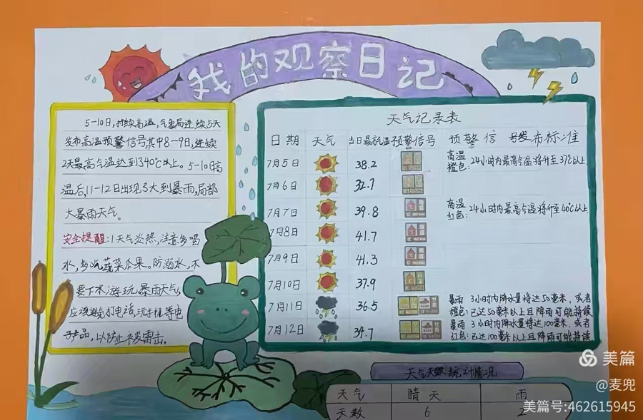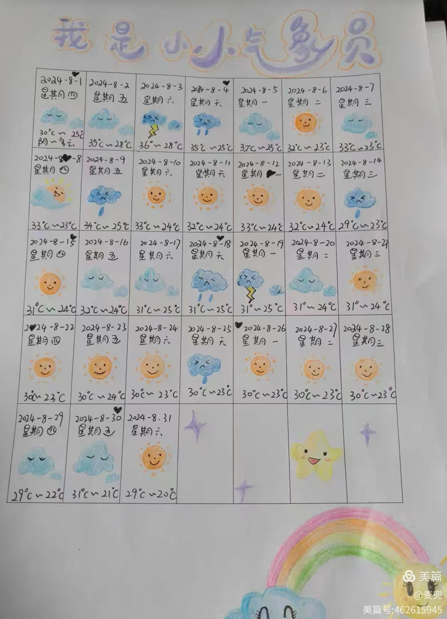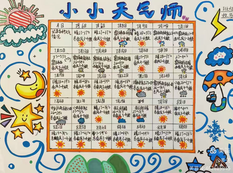 天气是如何记录的呢?气象数据是怎样分析出来的呢?带着这些问题,在班主任马老师的带领下我们在暑假期间开展了“我是小小气象员”的天气记录统计主题活动。