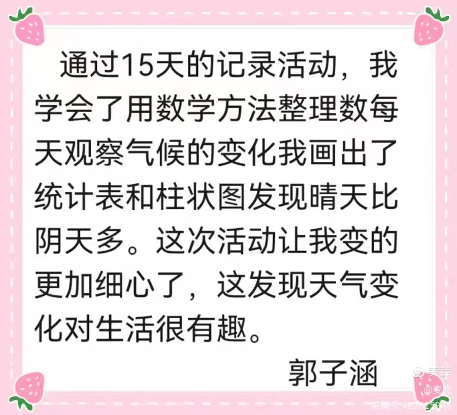 本次活动,我们通过对数据的收集、整理、描述和分析以及对事件发生可能性的刻画,来帮助我们清晰、客观地认识世界,也让我们在加深对天气情况、环境情况了解的过程中,充分地认识到统计知识在生活的意义和作用,下面是我们参与此次活动的感受。