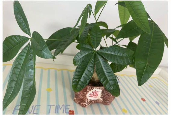 韩羽楺、王奕涵同学观察家里的绿萝、发财树,学习如何浇水能够让它们生长得茂盛。