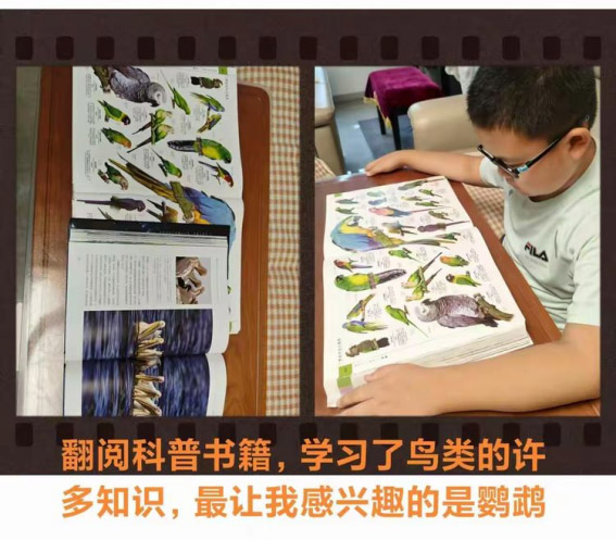 张颖瑜同学翻阅科普类书籍,了解鸟类的相关知识。