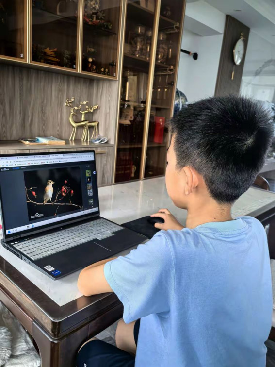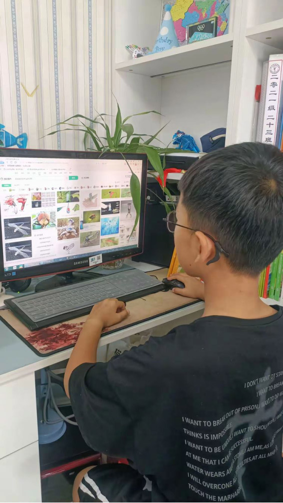 赵峻熙同学在网络上查询昆虫仿生学的应用。