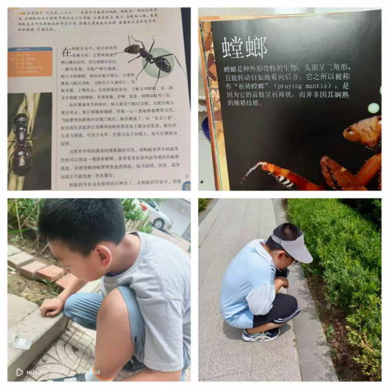 曹致远、孟祥骏、龚正同学通过翻阅书籍和实地观察,了解蚂蚁、螳螂的生活习性。