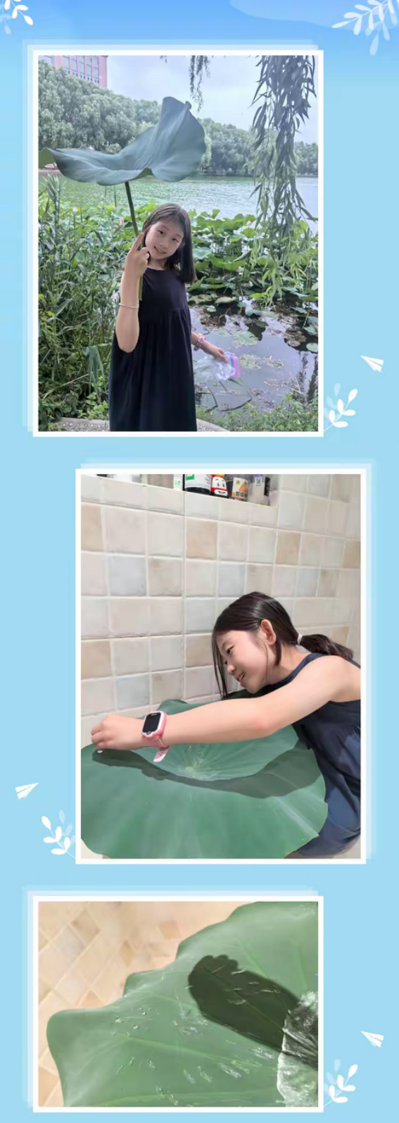 她发现荷叶不仅形状像雨伞,而且真的可以像雨伞一样,使落在上面的水滴滑落,不留一点儿痕迹。在爸爸的帮助下,她了解到这叫做“超疏水”现象。