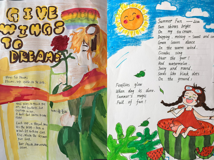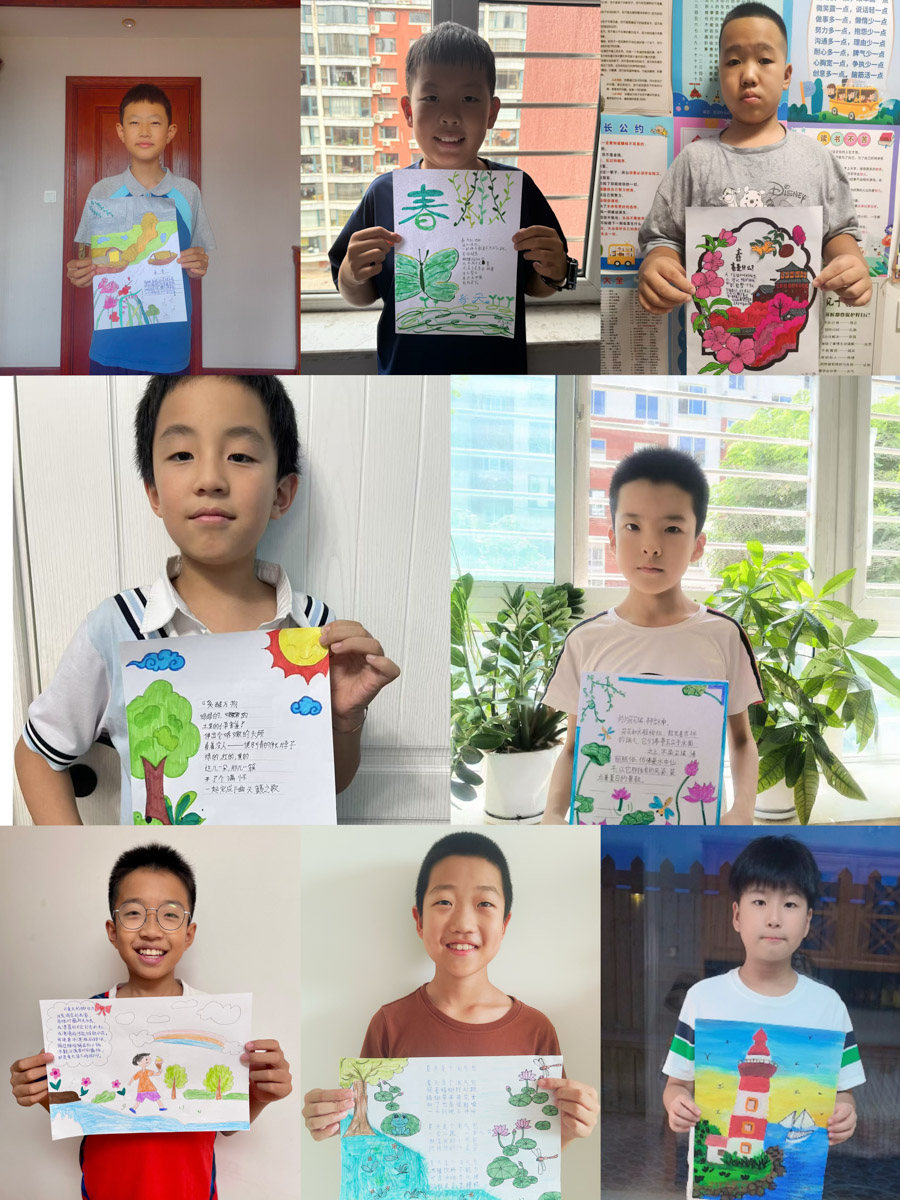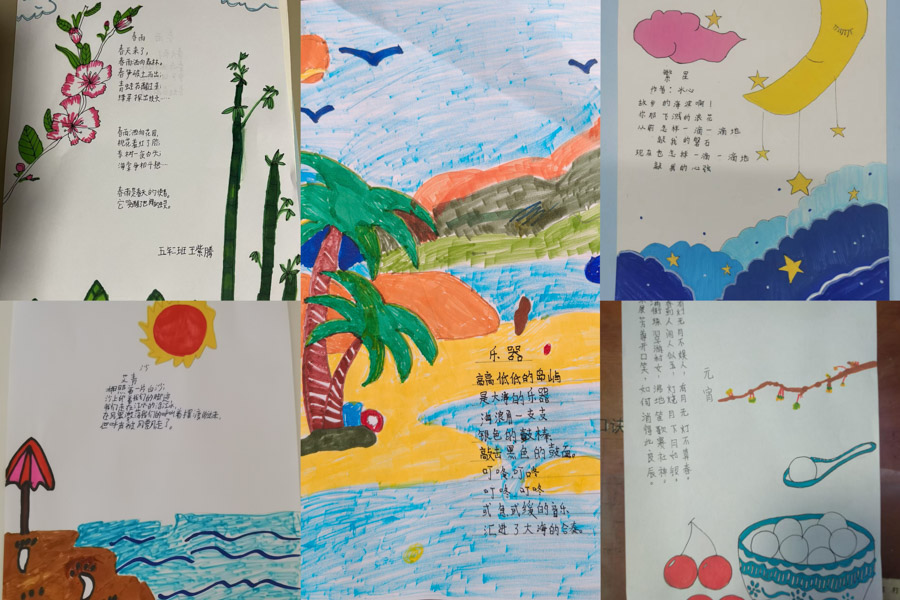 孩子们广泛阅读各类名家现代诗歌作品,从中选择最触动心弦的诗歌,工整地誊写到纸张上,并配上合适的插图,加深对诗歌的感受和体验。让冰心的哲思、艾青的热忱、戴望舒的浪漫在笔尖流淌。创意满满的仿写环节,更是让“诗是无形画,画是有形诗”的美学意境悄然绽放。