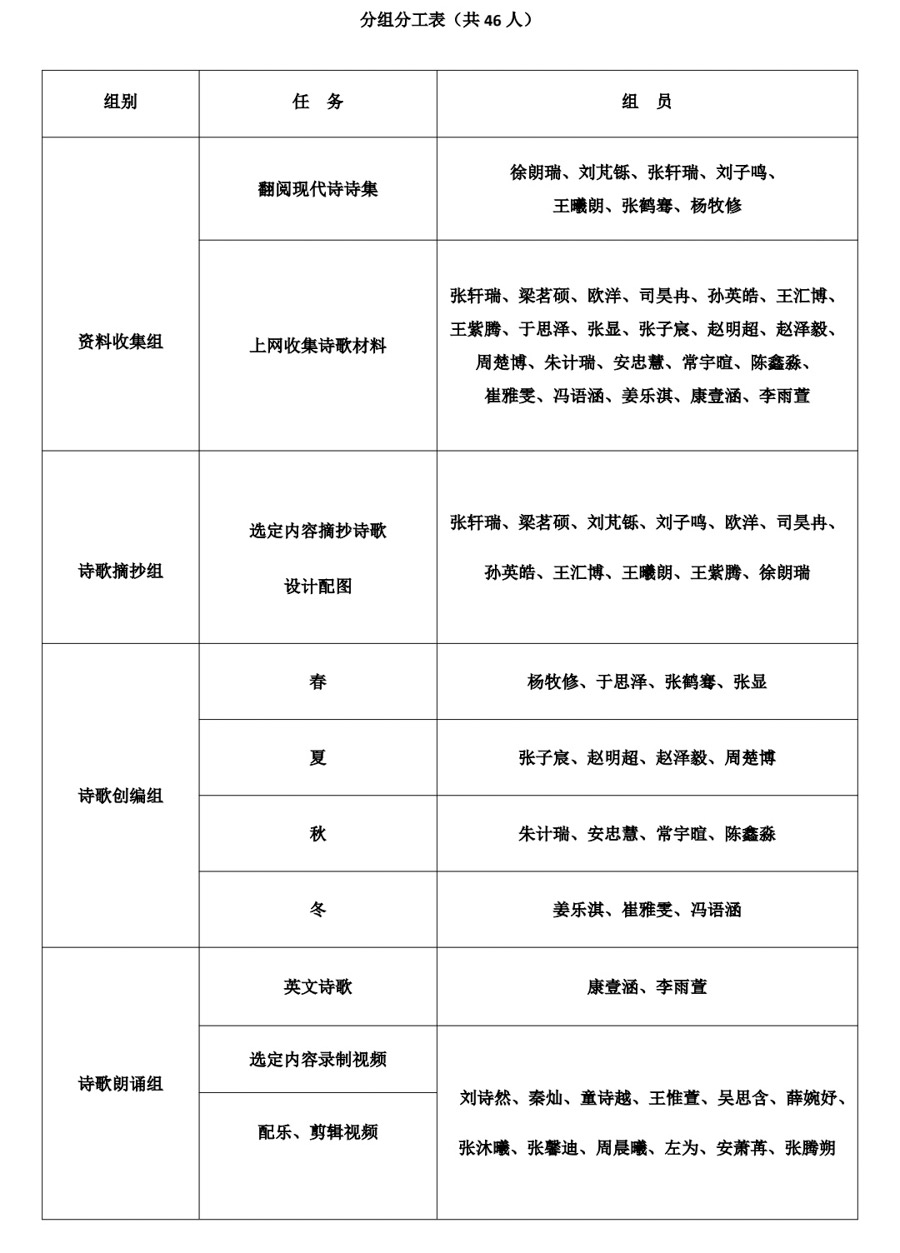 2.构建团队,制定分工表。根据每名同学的长处,划分为资料收集组、诗歌摘抄组、诗歌创编组和诗歌朗诵组。