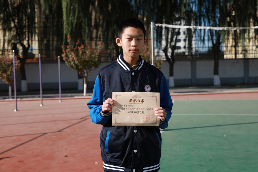 他热爱劳动,主动承担班级卫生清扫、桌椅整理等任务,从不推诿,不怕苦累,用实际行动诠释劳动精神。面对劳动任务总是冲在前面,无论是班级大扫除还是校园志愿服务,都认真负责 、高效完成,用汗水展现新时代学生的劳动担当。