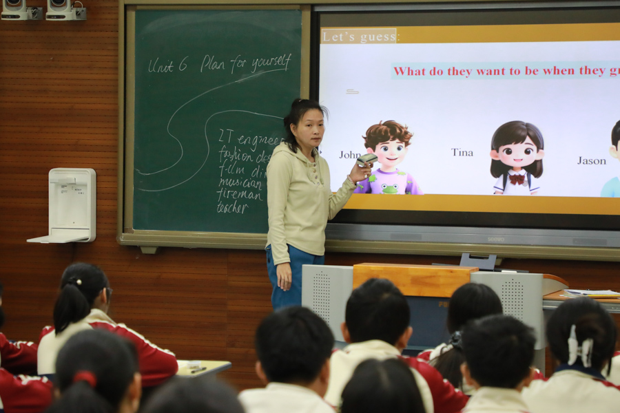 第二堂课由吴英华老师执教8年34班,她以“职业画像猜猜看”活动导入,AI辅助教学,带领学生走进不同的职业,引导学生思考“职业所需的能力”,层层递进地挖掘主题深度。课堂上,她以近日学校举办的科技节为线索,深度挖掘听力文本,随后设计了记者采访任务,让学生以小组为单位,用英语梳理“理想职业-所需技能-努力方向”,既培养了学生的逻辑思维,又让英语学习与人生规划紧密结合,实现了“语言教学”与“价值引领”的双重目标。