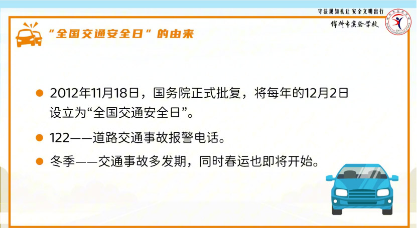 班会伊始,主持人首先介绍了“全国交通安全日”的由来与重要意义。通过讲解,同学们了解到全国交通安全日设立在12月2日,既因其与交通事故报警电话“122”紧密相连便于记忆,也旨在应对冬季交通事故多发期的挑战,具有深刻的现实意义。