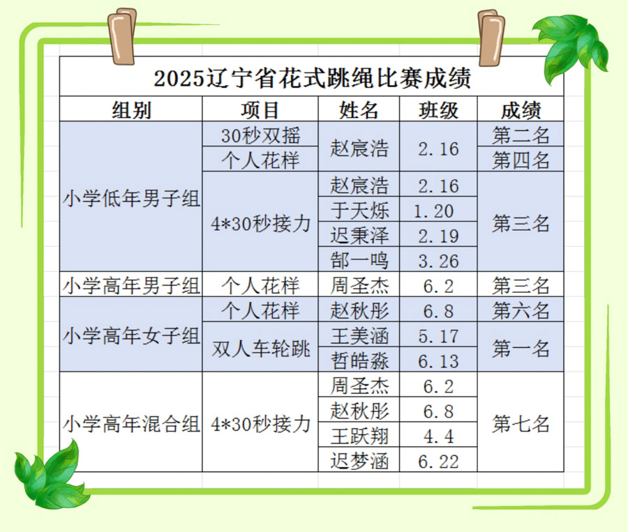 近日,辽宁省学生跳绳锦标赛圆满落幕,我校小学部跳绳队在30秒单摇、4×30秒接力、个人花样、两人车轮跳四项比赛中取得佳绩。