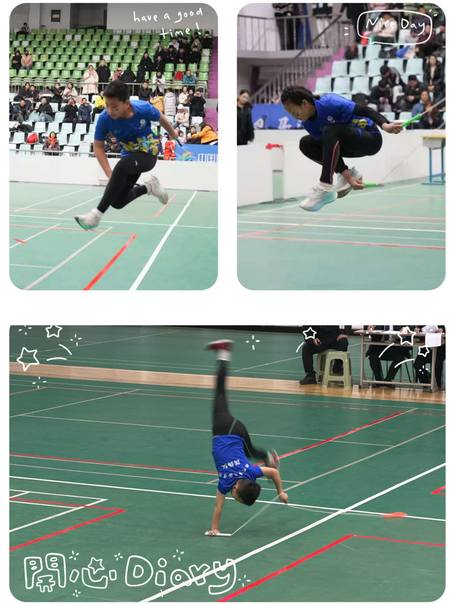 个人花样和两人车轮跳赛场上,小选手们动作流畅,在音乐节奏中做出各种巧妙的编排,时而旋转,时而跳跃,整套动作完成得整齐规范。