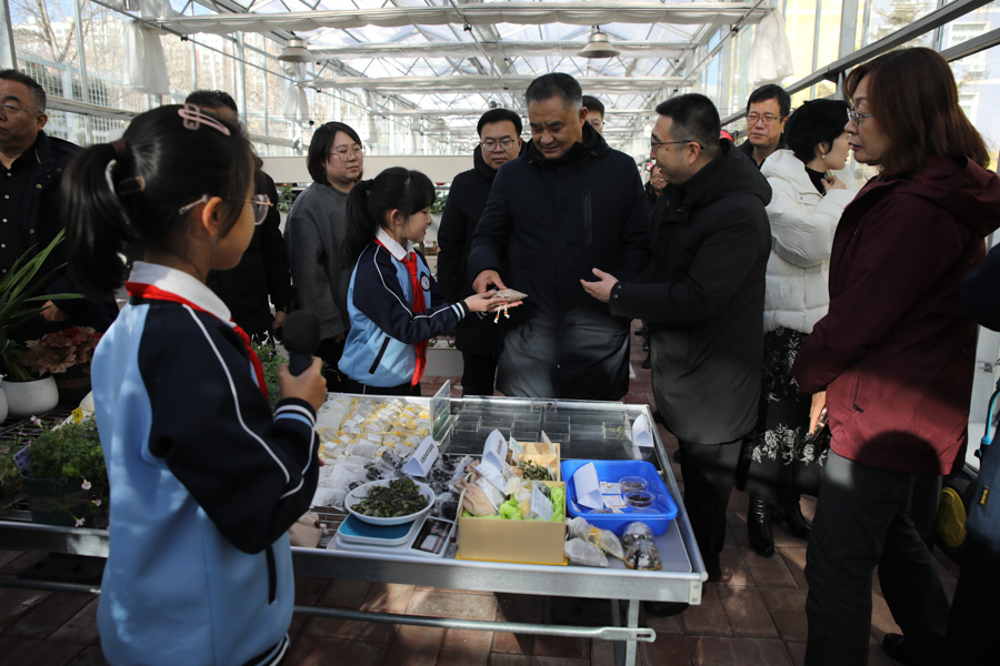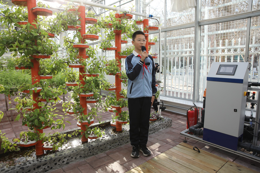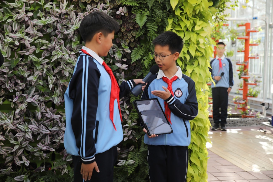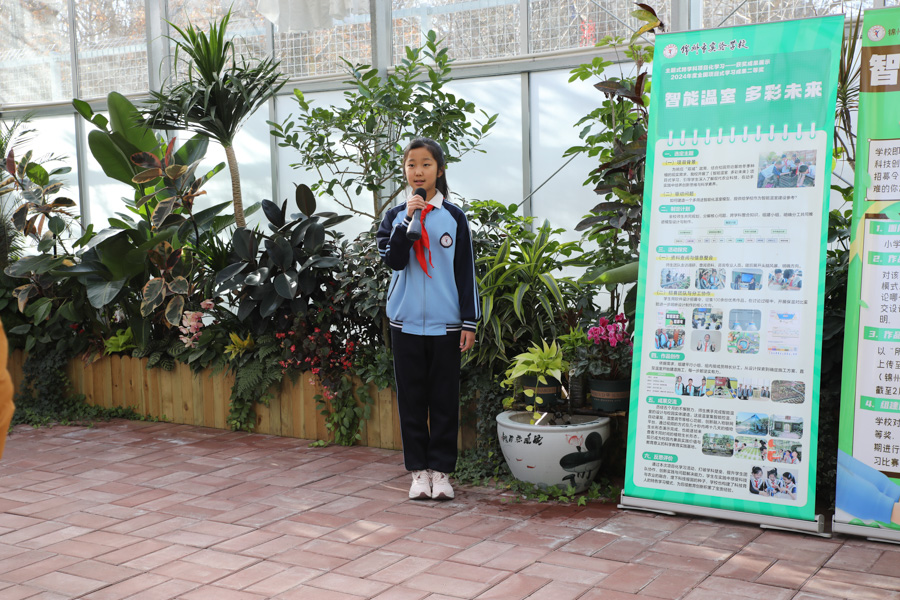 调研团队首先探访智能温室实践基地,沉浸式感受科技赋能科学教育的生动场景。小讲解员介绍,该温室占地312平方米,融合劳动与科学教育,设有环境监测、智能化管理等八大功能模块,践行“做中学、学中研”理念。温室内花卉、蔬菜的生态种植,成为科学与劳动教育落地的鲜活缩影;小志愿者现场演示传感器数据采集、代码编写调控灌溉系统,通过PAD终端精准调节温湿度与光照,直观展现了实验少年扎实的科学素养与实践能力。随后,五年一班、五年二十班的项目化学习团队,分别分享《绿色智慧 锦城良方》《绿动校园·微生态智控温室》探究成果,创新思路与实践能力获嘉宾高度关注。