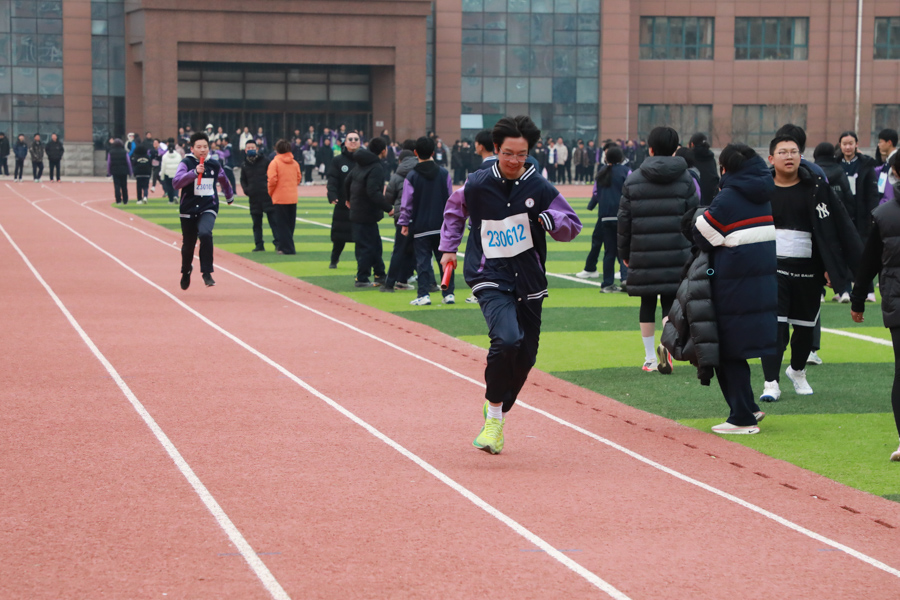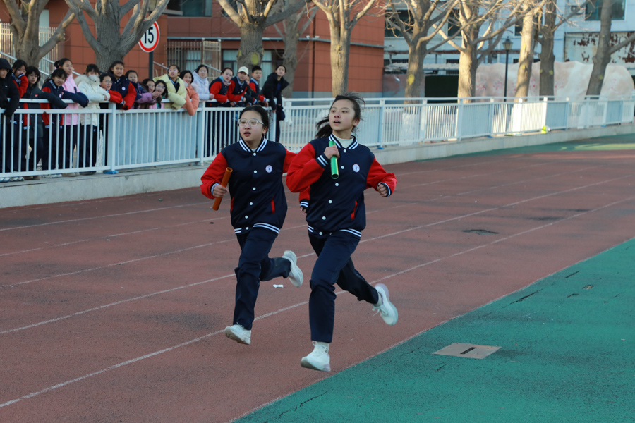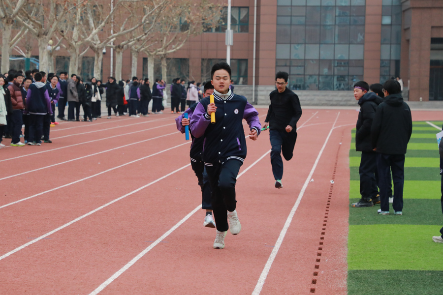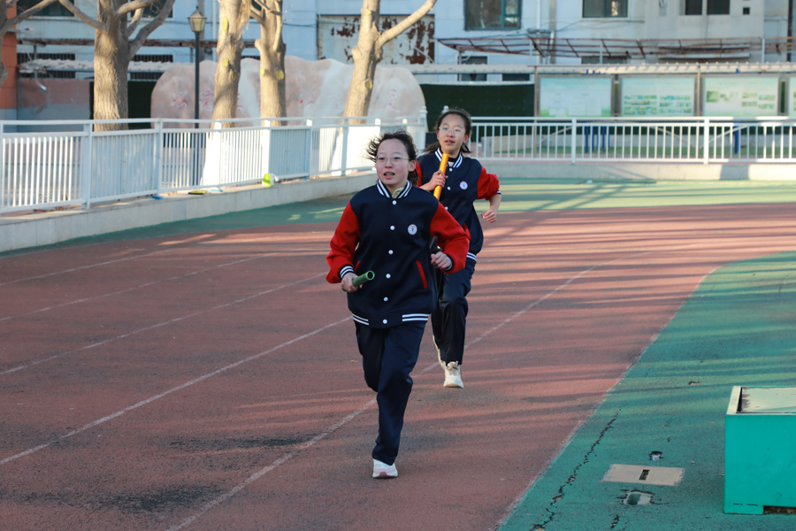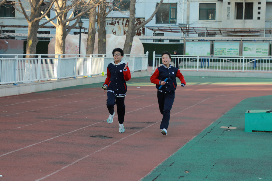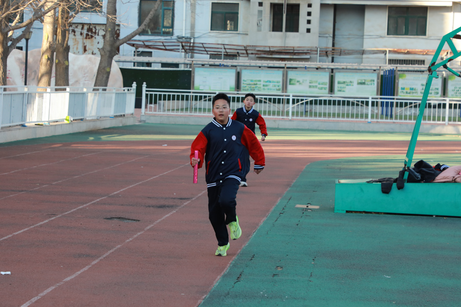 随后,副校长郭聪冲发令,听到枪声响各班的第一棒选手像离弦的箭一样冲了出去,跑道两侧的啦啦队举着班级牌,喊着“加油!加油!”的口号,整个校园瞬间被点燃。