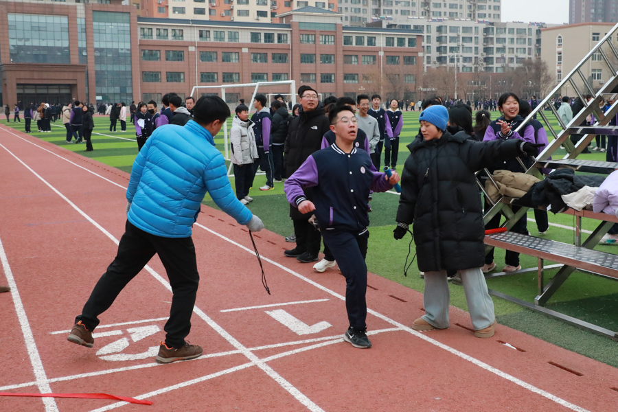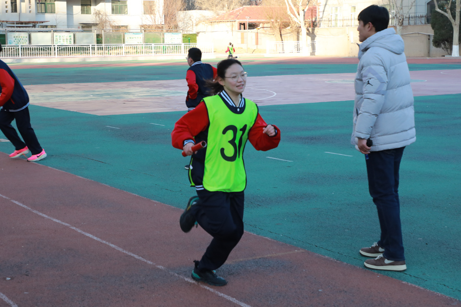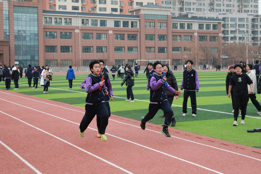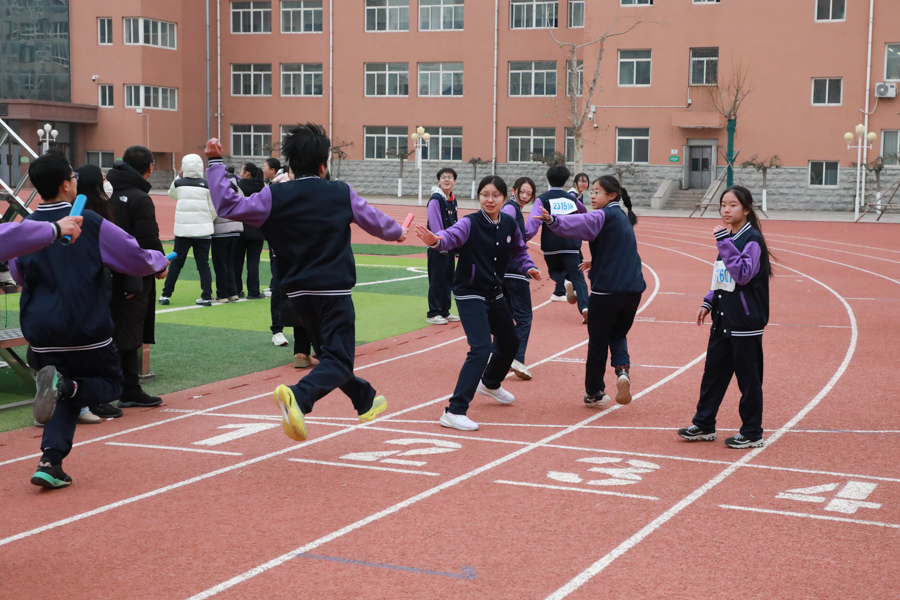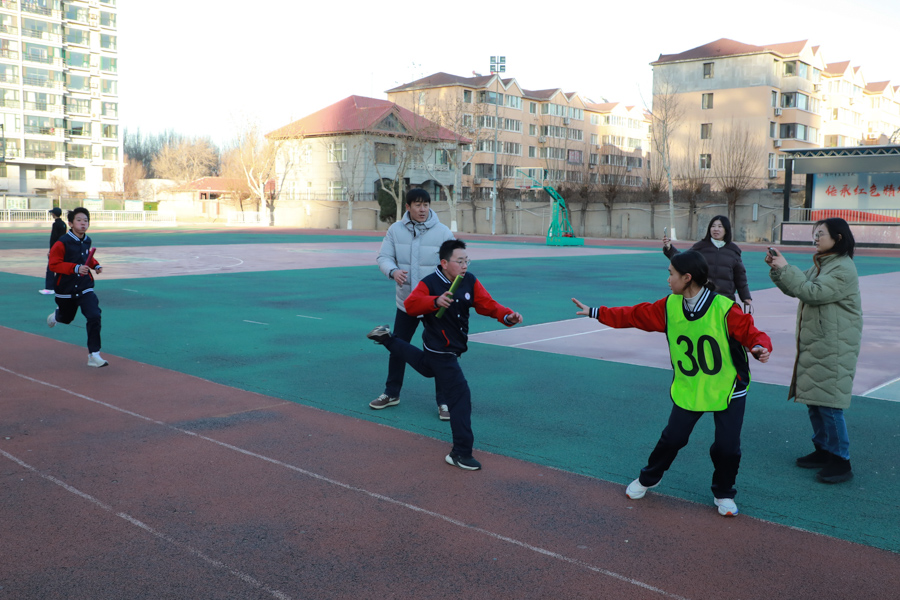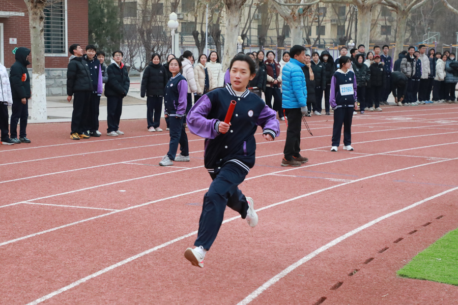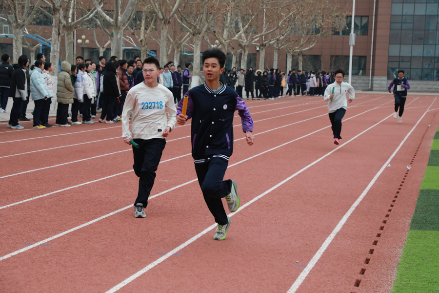随后,副校长郭聪冲发令,听到枪声响各班的第一棒选手像离弦的箭一样冲了出去,跑道两侧的啦啦队举着班级牌,喊着“加油!加油!”的口号,整个校园瞬间被点燃。