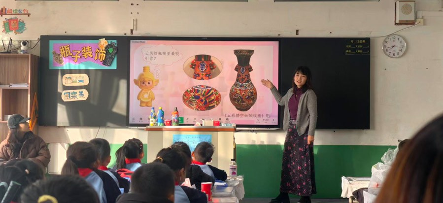 杨旭老师则以“粘土塑形”为教学核心,另辟蹊径演绎“变废为宝”的艺术魅力,聚焦“改变瓶子原有形态、激发创意表达、浸润传统文化”的教学目标。课堂上,杨老师创设“瓶子王国时装秀”的趣味情境,通过卡通角色“巧巧”发布设计任务,瞬间点燃学生的学习兴趣。教学中,杨老师充分利用粘土可塑性强、色彩丰富的特点,引导学生打破对废旧瓶原有形态的认知,通过揉、捏、搓、压、贴等基础泥塑技法,为瓶子重塑造型——或添加可爱的动物轮廓,或塑造精美的几何纹样,或融入传统纹饰灵感,让普通的废旧瓶蜕变为独具个性的立体艺术作品。同时,杨老师注重传统文化浸润,引导学生赏析越窑青釉黄鼬把瓷鸡首壶、五彩镂空云凤纹瓶等古代瓶器,从传世国宝中汲取造型、色彩与图案之美,将传统美学与创意实践有机融合。在环保理念渗透上,杨老师通过展示捷克艺术家塑料瓶环保艺术品,引导学生感受废旧材料的艺术价值,潜移默化传递“资源循环、绿色生活”的理念,让学生在动手塑形中锻炼立体造型能力,在创意表达中提升审美感知力。