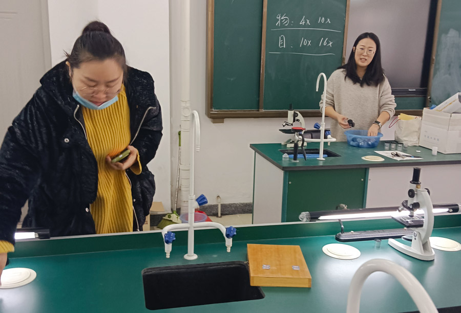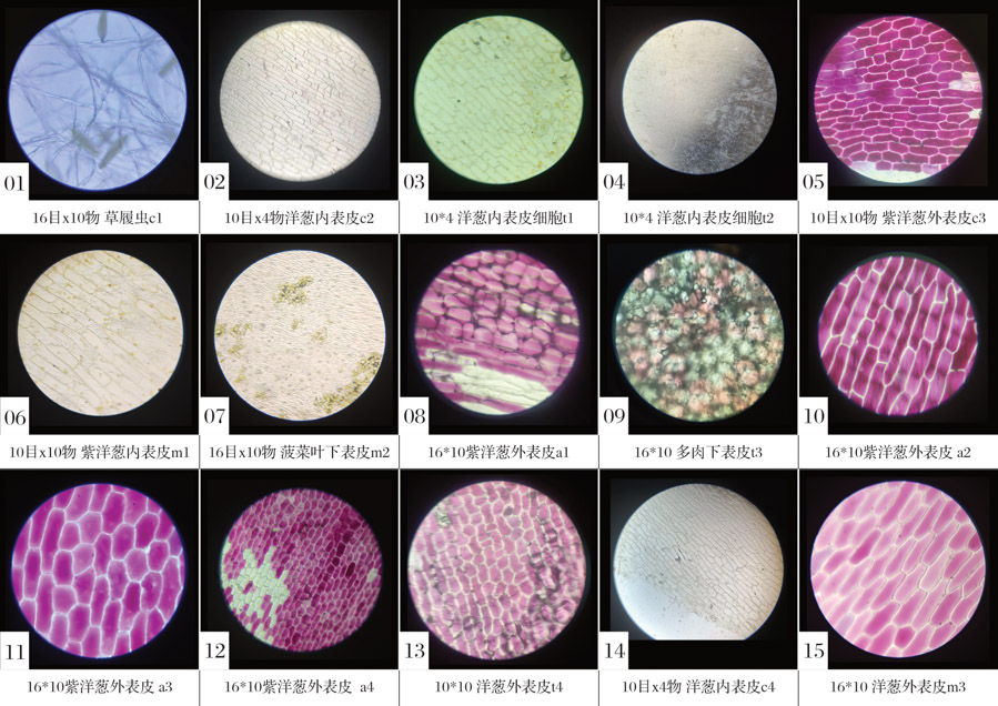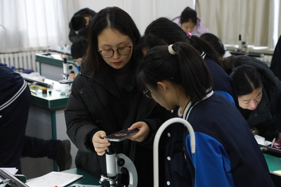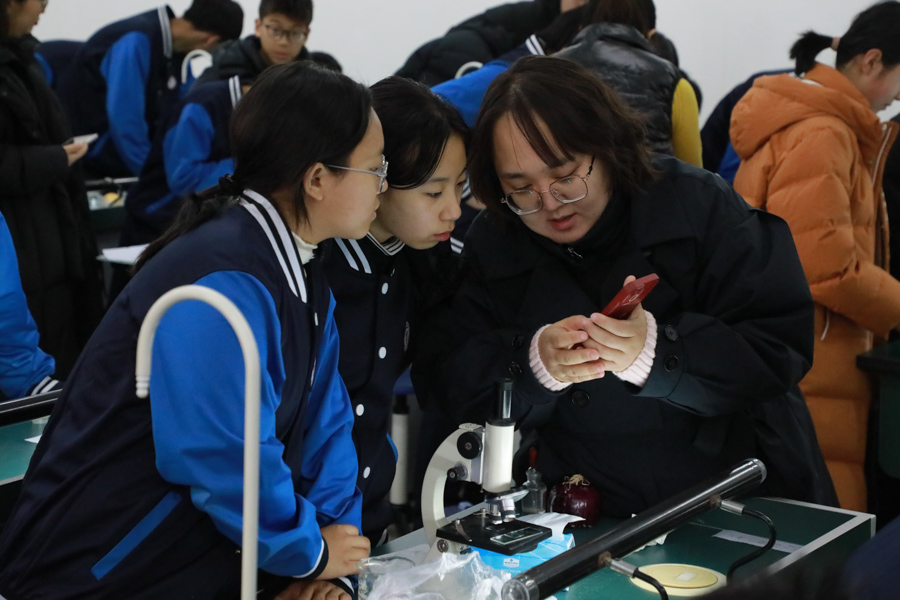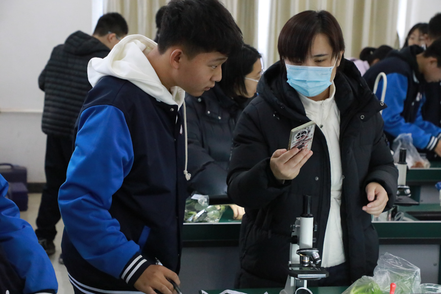 竞赛现场,选手们根据自选材料分工协作:有的精准撕取植物表皮,有的细致展平材料并滴加染液,缓缓盖上盖玻片的动作里,藏着对实验细节的严谨把控。完成装片制作后,选手们将玻片放置在显微镜载物台上,通过调试光源、转动粗准焦螺旋和细准焦螺旋逐步对焦,直至清晰捕捉到微观物像,此时教师会用手机对准显微镜目镜,将学生找到的清晰视野拍摄记录,作为评判的核心依据。