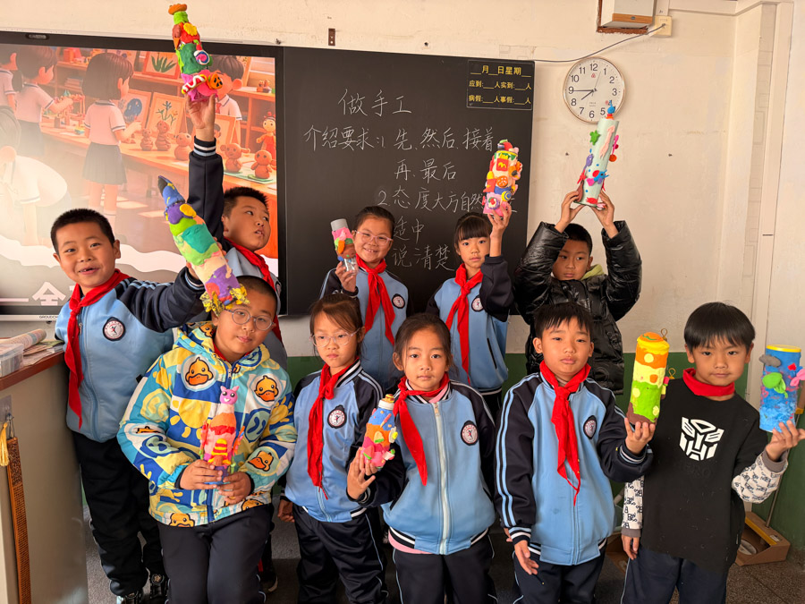 语文课上,超有趣的“巧手电视台”正式开播!孩子们轮流变身“小嘉宾”和“小记者”,在“个人专访间”里两两搭档,用“先、然后、接着、最后”这些顺序词,把自己作品的名字、用的材料和制作步骤说得明明白白;“主舞台秀”环节,大家自信地举起作品,分享自己的创作小思路;“观众热线”一开通,现场更热闹了,小观众们积极提问、真心赞美小伙伴的作品。在轻松欢乐的氛围里,孩子们不仅会做手工,还学会了清晰表达,实现了从“会做”到“会说”的小飞跃!