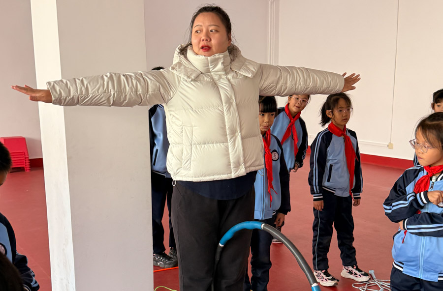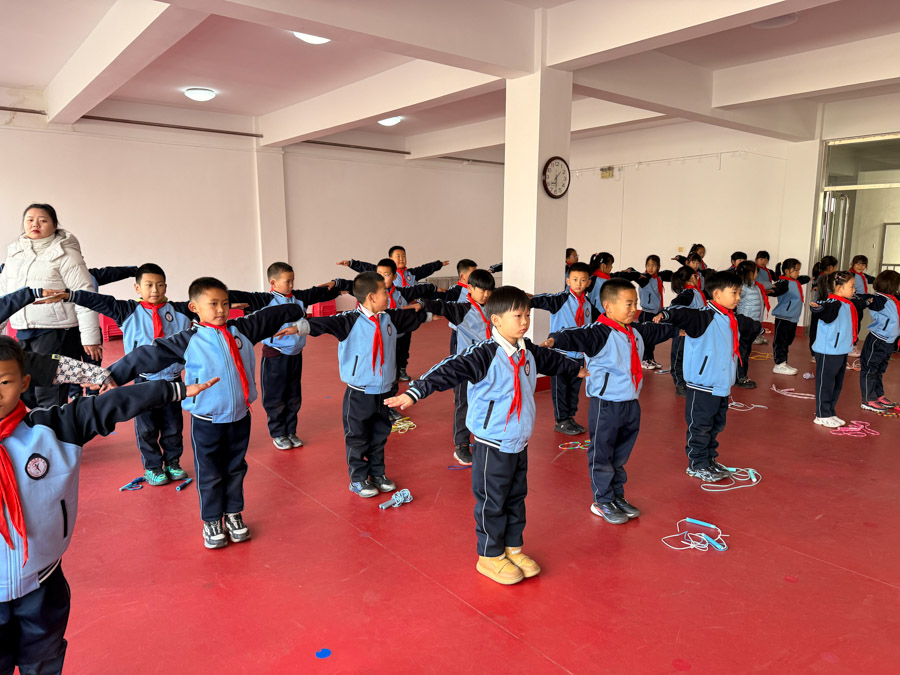 体育课堂则把对称学习变成了一场动感小游戏!热身时,孩子们跟着老胡盈盈老师做动作,模仿镜子里的对称身影,直观感受到了身体的对称美;“器材对称找朋友”环节,大家拿着跳绳、羽毛球拍,认真找起了它们的对称轴;“对称图案大挑战”中,有的同学用跳绳摆出漂亮的对称图案,有的小组合作搭出大型对称造型,既锻炼了空间想象力,还学会了和小伙伴配合;“穿越对称之门”游戏里,孩子们摆出双臂侧平举、双手合十跳跃等对称动作闯关,在欢声笑语中提升了身体协调性和平衡能力。