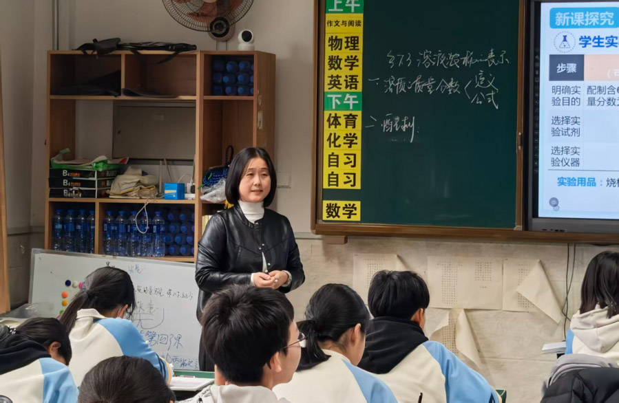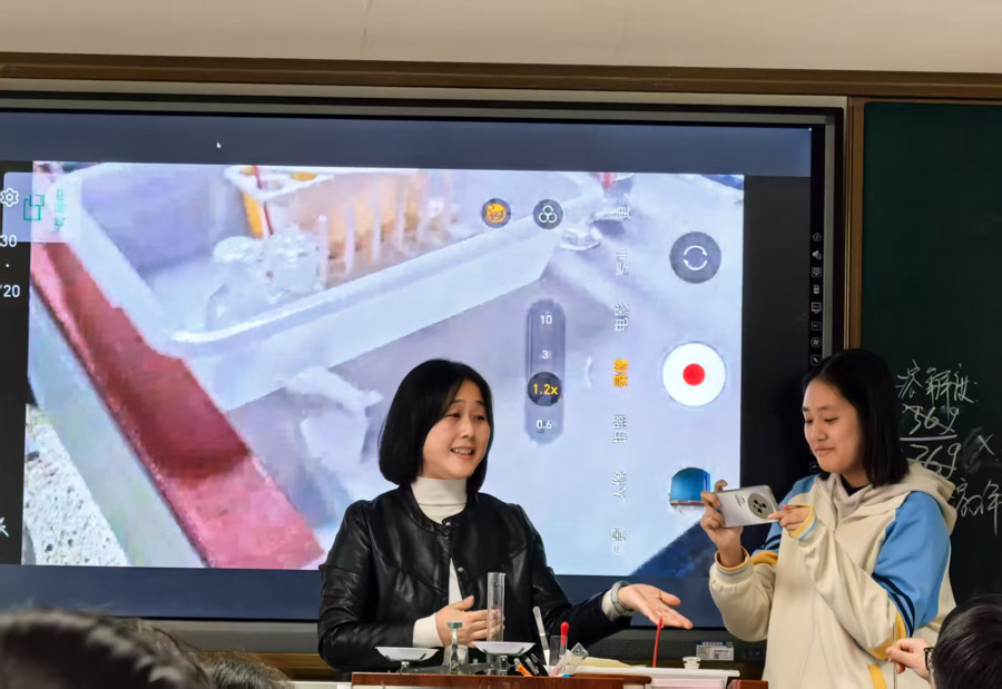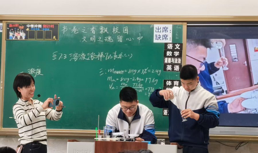 课堂上,卢翠云老师创设真实生活情境,以“营养液浓度表示、配制、稀释”三个进阶问题为主线,引导学生在解决实际问题中深化概念理解,课堂高效严谨,尽显模型建构的教学匠心。姜如松老师则以教材人物对话为线索,借助即梦AI将静态图片化为动态动画,让课堂趣味盎然。姜老师的课堂将知识融入欢笑,尽显灵动创新的教学智慧。配制溶液作为新课标要求的学生必做实验,两位老师均巧用希沃投屏放大实验细节,既放手让学生示范操作,又适时亲自指导,凸显实验教学的实效性。