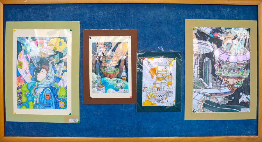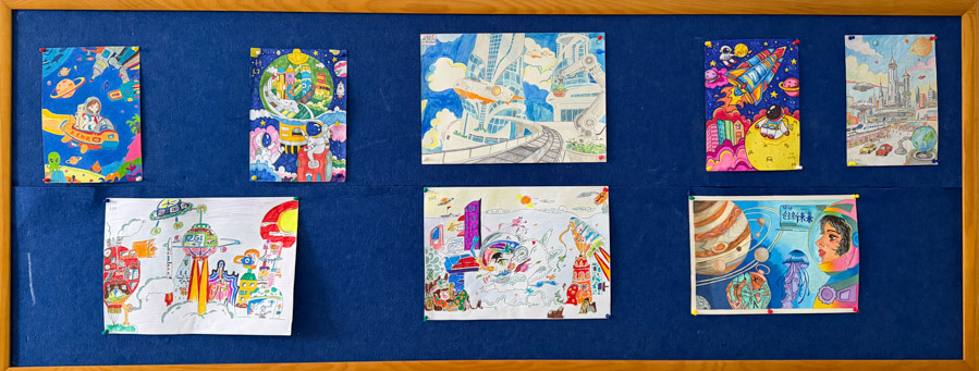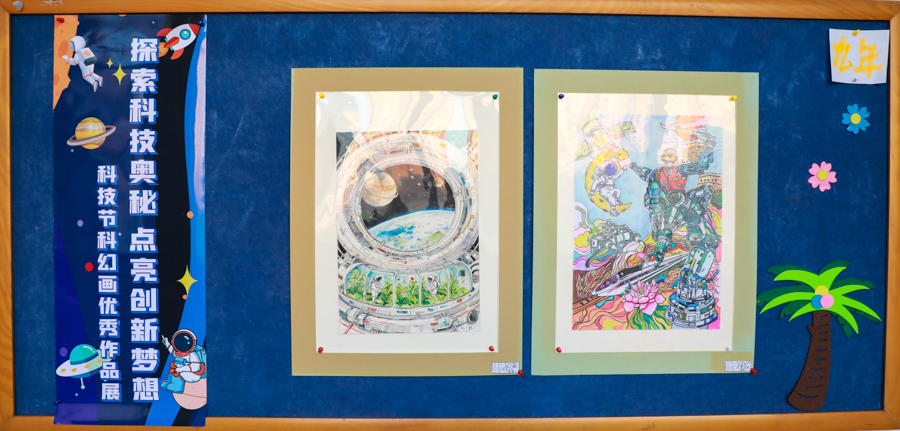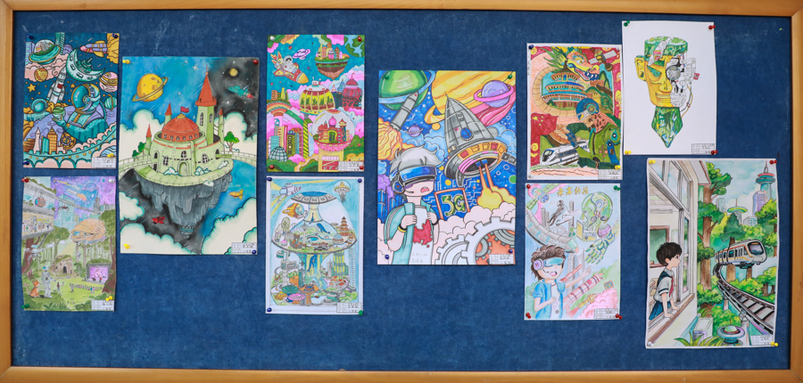 科幻画活动激发了学生对未来科技的无限遐想。科幻画板块成为了校园里的“创意焦点”。学生们以“未来科技与生活”为灵感原点,用画笔勾勒出天马行空的想象:有的作品描绘了AI生态城市中,会呼吸的建筑与悬浮交通共生;有的则聚焦星际探索,将太空农场、量子通讯设备搬进了画卷;还有作品以“环保科技”为主题,设计出能净化海洋的智能水母机器人。