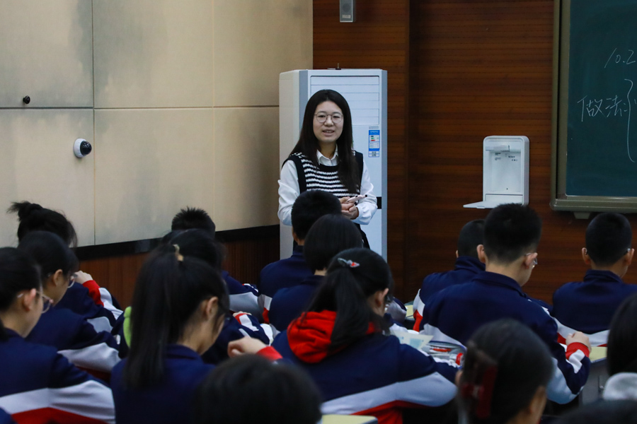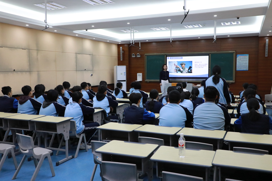 同课异构,异曲同工。两位老师的课堂设计各有千秋,却都紧扣“捍卫国家利益”的主题,让学生在感悟与思辨中厚植家国情怀。生雨竹老师以思辨性问题为抓手,设计了层次鲜明的三大环节,搭配铿锵有力的誓言环节,让学生在沉浸式体验中读懂家国大义。环节一“青春抉择 守卫祖国燃热血”,教师以“如果有这样一份工作你愿意参加吗”为切入点,抛出“面对国家需要,青年该作何选择”的思辨问题,引导学生从戍边战士的担当故事中寻找答案;环节二“大义取舍 家国情怀释初心”,聚焦“小家与大国”的辩证关系,通过戍边军人与科研工作者的奉献故事,让学生在讨论中明晰个人利益与国家利益的关系,领悟“舍小家为大家”的初心;环节三“青春接力 以少年行爱国志”,结合校园生活与社会热点,让学生探寻新时代青少年捍卫国家利益的实践路径。课堂尾声的誓言环节将氛围推向高潮,全体学生起立高呼“强国有我”,铮铮誓言彰显着少年的责任与担当。整节课层层递进、环环相扣,以思辨撬动深度思考,让家国情怀真正扎根学生心中。